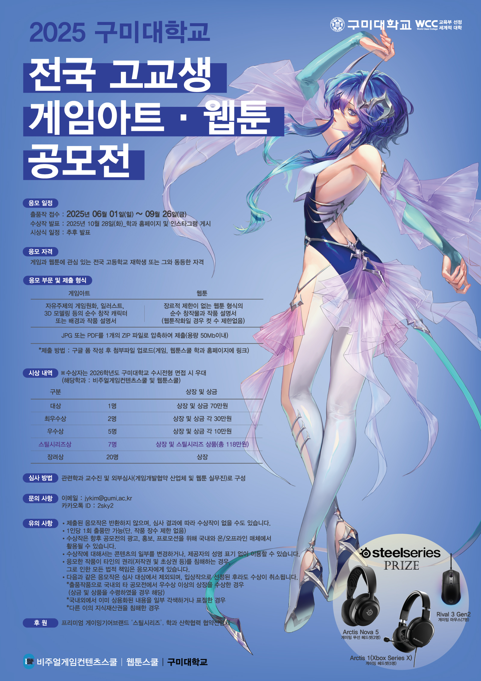 구미대학교(총장 이승환)가 ‘2025 전국 고교생 게임아트․웹툰 공모전’을 개최한다. 올해 6회째를 맞는 이번 공모전 출품작은 2025년 9월 27일까지 접수한다.
