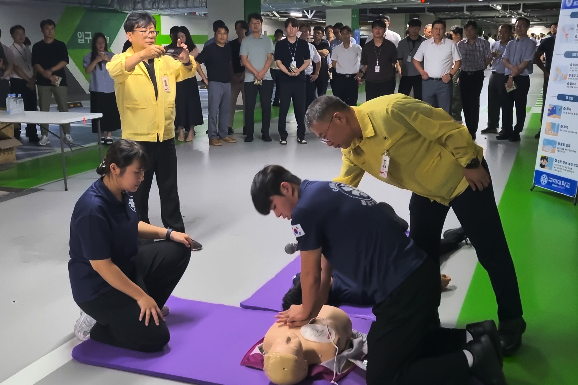 이날 교육은 구미대 응급구조학과 교수진과 재학생들이 강사로 참여해 ▲심폐소생술(CPR) ▲자동심장충격기 사용법(AED) ▲기도 폐쇄 응급처치 ▲출혈 및 골절 시 대처법 등 실제 상황을 가정한 실습 중심의 프로그램으로 진행됐다.
