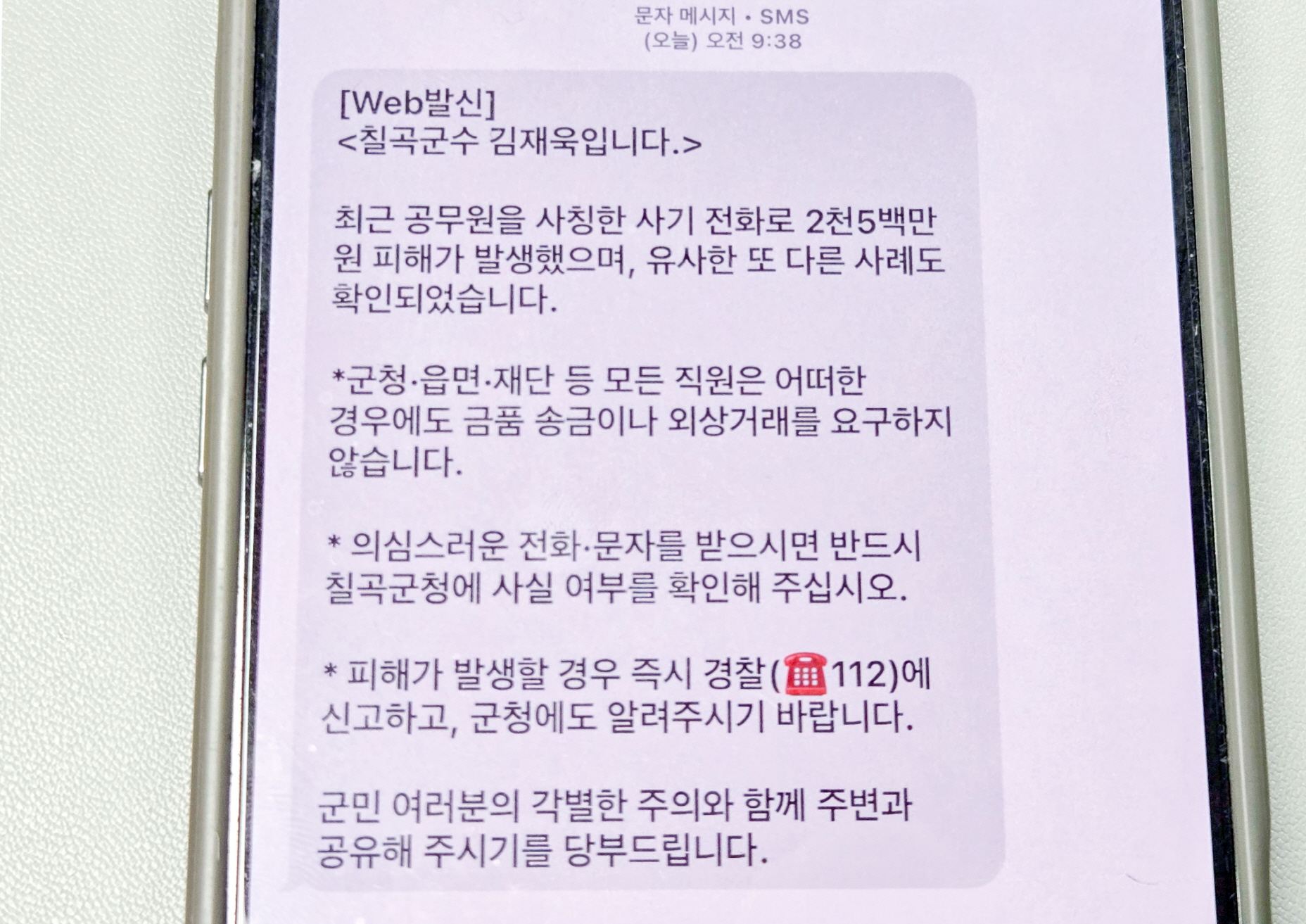 | ↑↑ 칠곡군이 공무원 사칭 전화 사기 피해 발생 직후 군민들에게 긴급 안내 문자를 발송했다. |