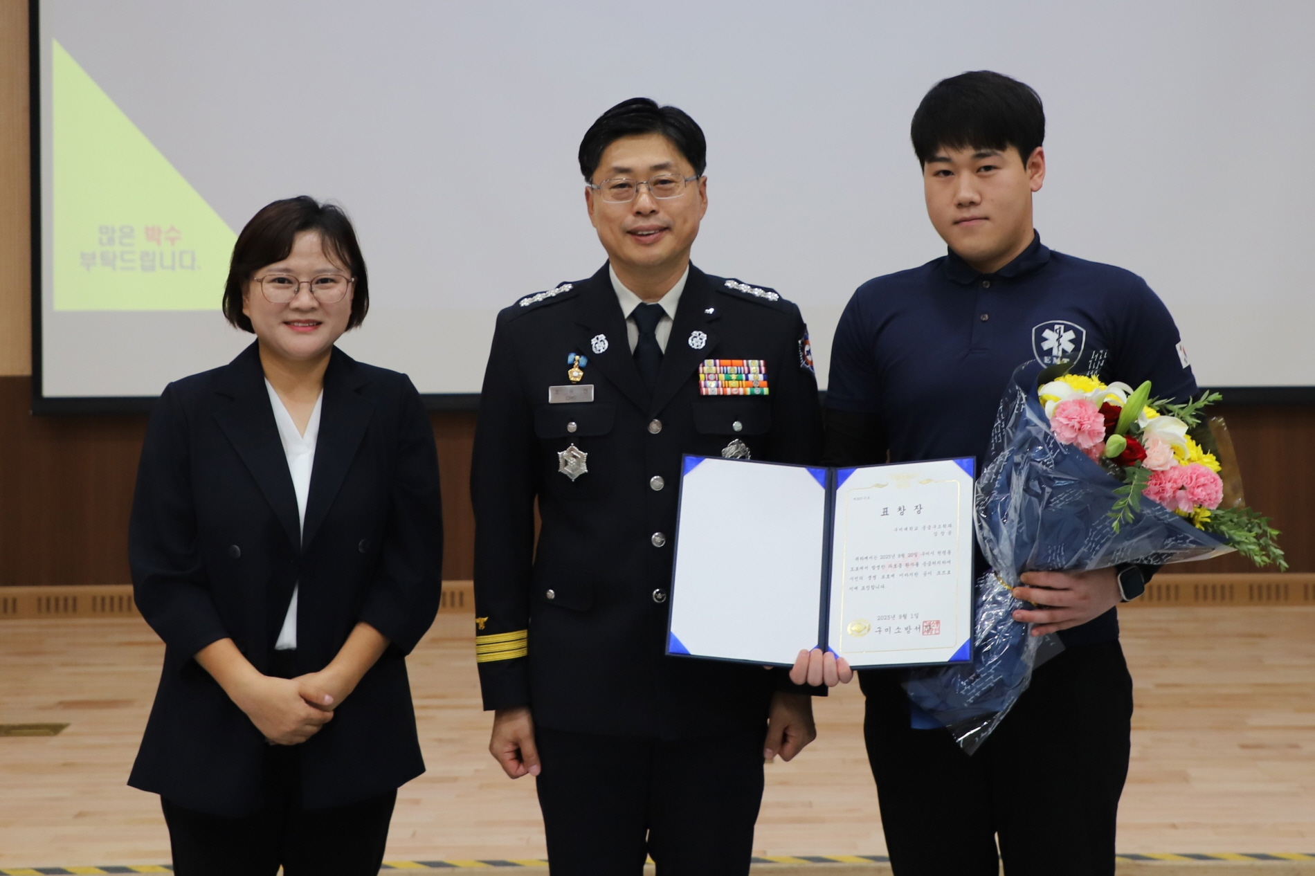 이 같은 소식이 알려지자 구미소방서는 시민 생명 보호에 기여한 공로로 지난 1일 김창공 학생에게 구미소방서장 표창을 수여했다.