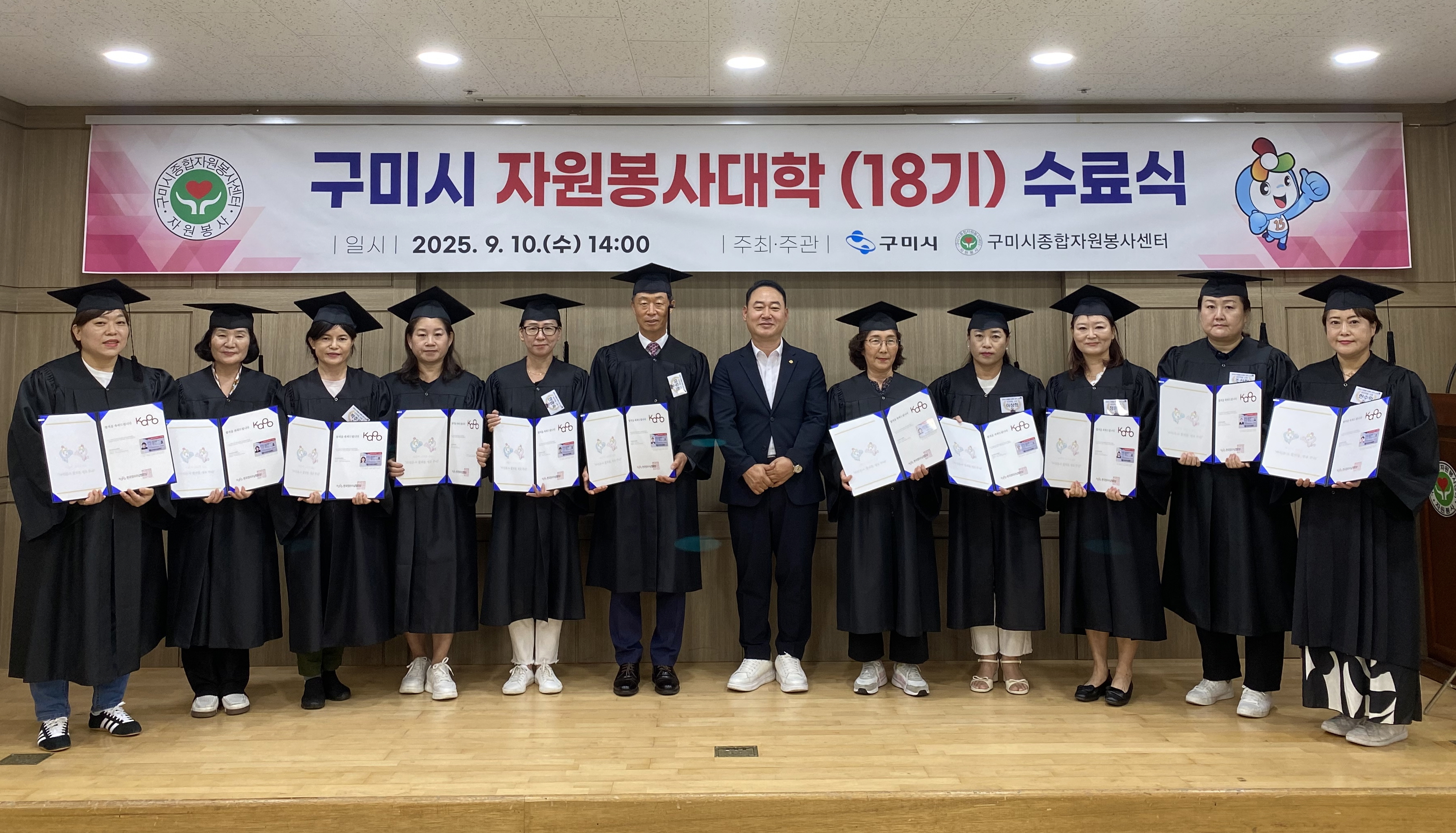 구미시는 지난 10일 구미시종합자원봉사센터(센터장 하준호) 주관으로 자원봉사대학 18기 수료식을 열고, 5개월 간 이어진 교육 과정을 성공적으로 마무리했다. 이번 수료식에서는 47명의 교육생이 수료증을 받았으며 우수자 시상, 결의문 낭독, 소감 발표 등이 이어졌다.