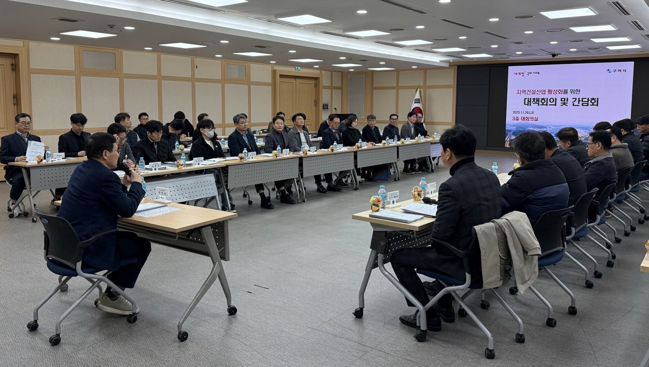 구미시는 28일 시청 3층 대회의실에서 변상용 시 도시건설국장 주재로 ‘지역건설산업 활성화를 위한 대책회의 및 간담회’를 개최했다. 이날 간담회에는 대한전문건설협회 구미시운영위원회, 대한기계설비건설협회 경북도회, 공동주택 등 주요 대형 건설현장 관계자와 구미시 관계 부서장 등 60여 명이 참석해 지역 건설산업 활성화와 상생 방안을 논의했다.
