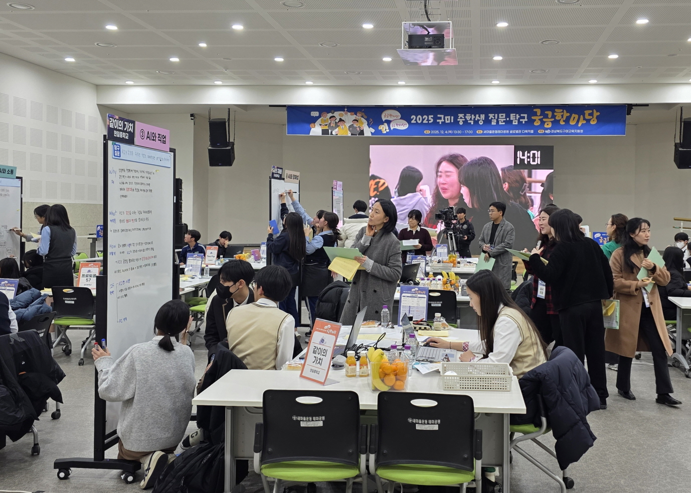 구미교육지원청(교육장 민병도)은 12월 4일 새마을운동테마공원 글로벌관에서 ‘2025 구미 중학생 질문탐구 궁금한마당’을 개최했다. 구미 관내 중학교 3학년 학생 9개 팀(34명)이 참여해 ‘AI(인공지능)’와 현장에서 추첨한 소주제를 기반으로 다양한 질문을 생성하고 탐구 활동을 진행했다.