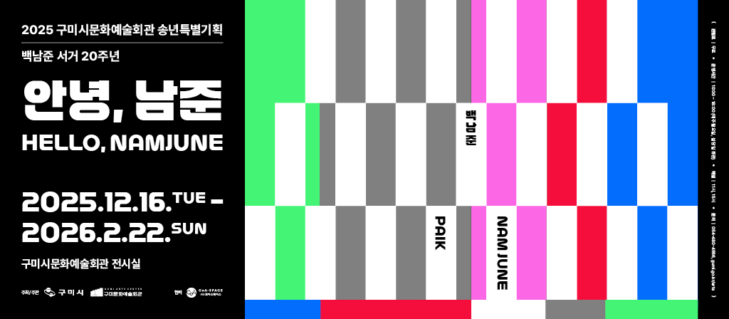 구미시는 세계적인 미디어 아티스트 백남준의 작품세계를 총망라한 송년특별전 <안녕, 남준 Hello, NAMJUNE>을 2025년 12월 16일부터 2026년 2월 22일까지 구미시문화예술회관 전시실에서 개최한다.