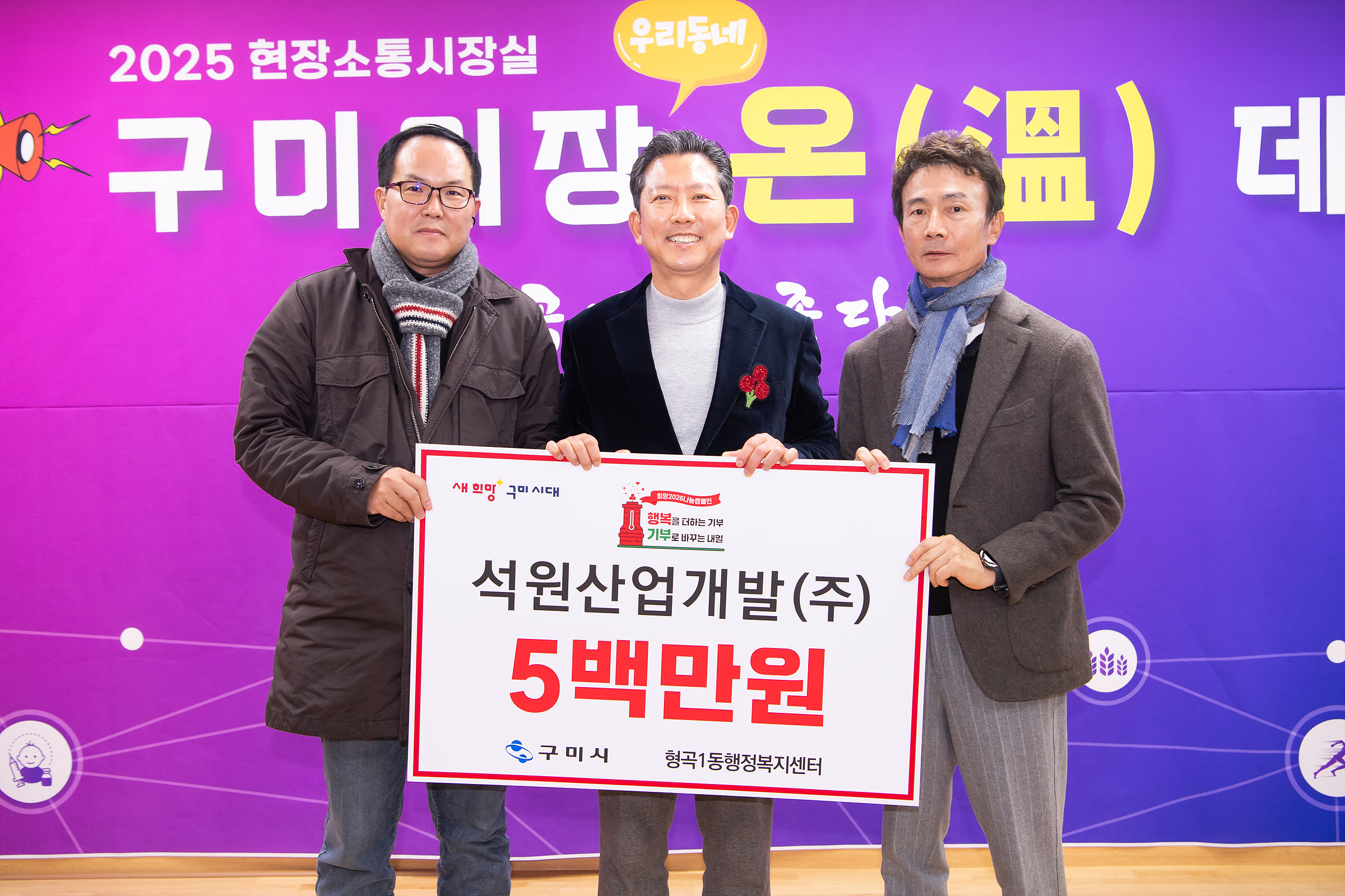 석원산업개발(주)(대표 박진형)은 지난 9일 형곡1동행정복지센터에 후원금 500만원을 전달했다.