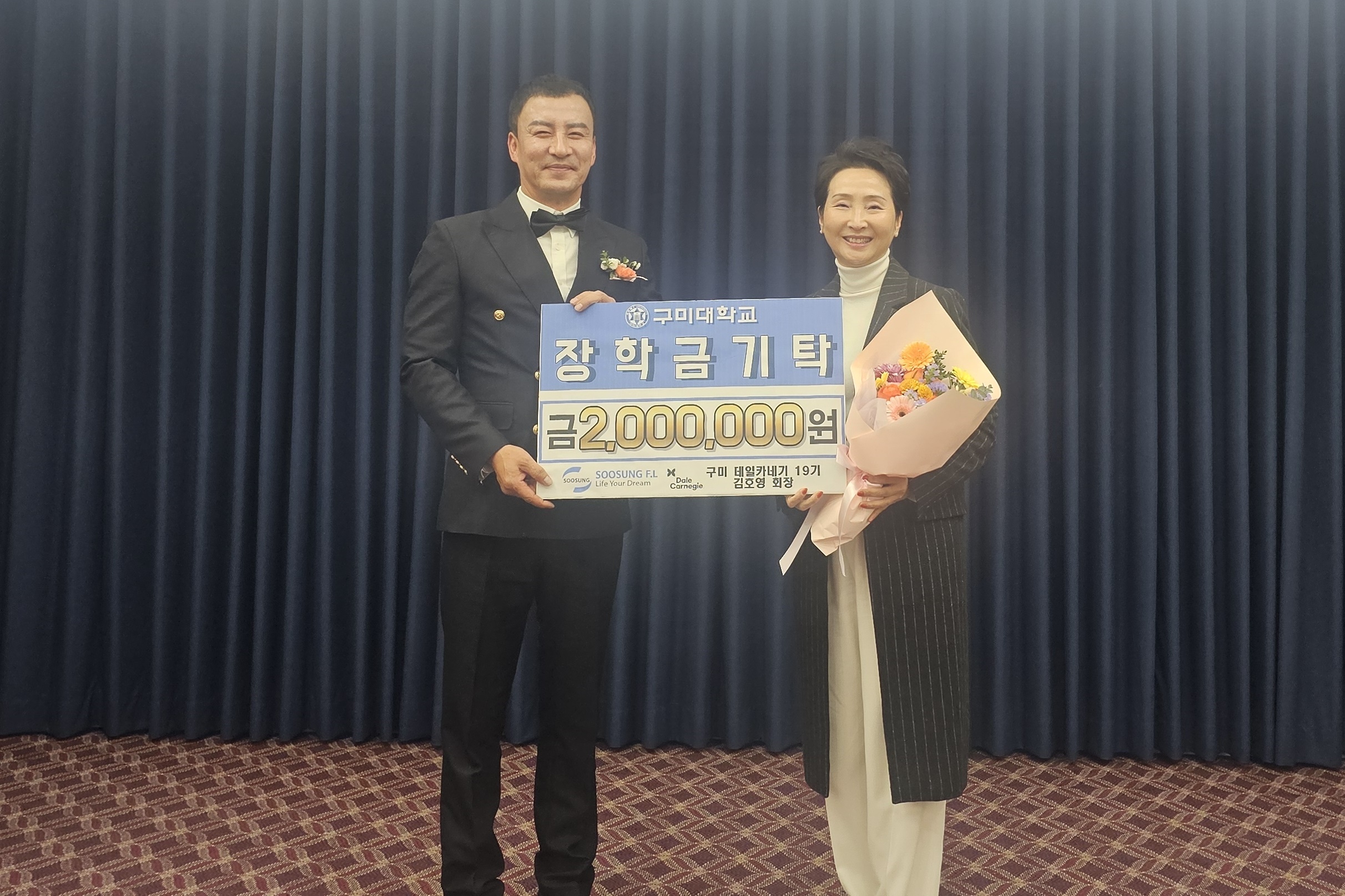 | ↑↑ 김호영 신임회장(좌측)이 석미란 구미대 호텔관광항공서비스과 학과장에게 장학증서를 전달하고 있다. |