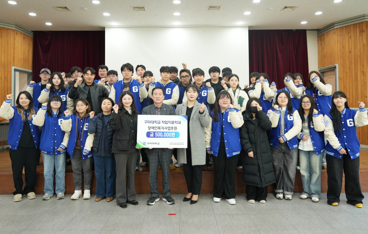 구미대학교(총장 이승환) 작업치료과가 학과 행사에서 마련한 기부금을 구미시장애인종합복지관에 전달해 주위를 훈훈하게 하고 있다.