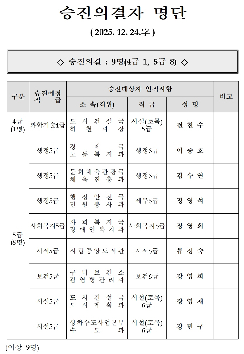 구미시가 12월 24일자 승진의결자를 발표했다.