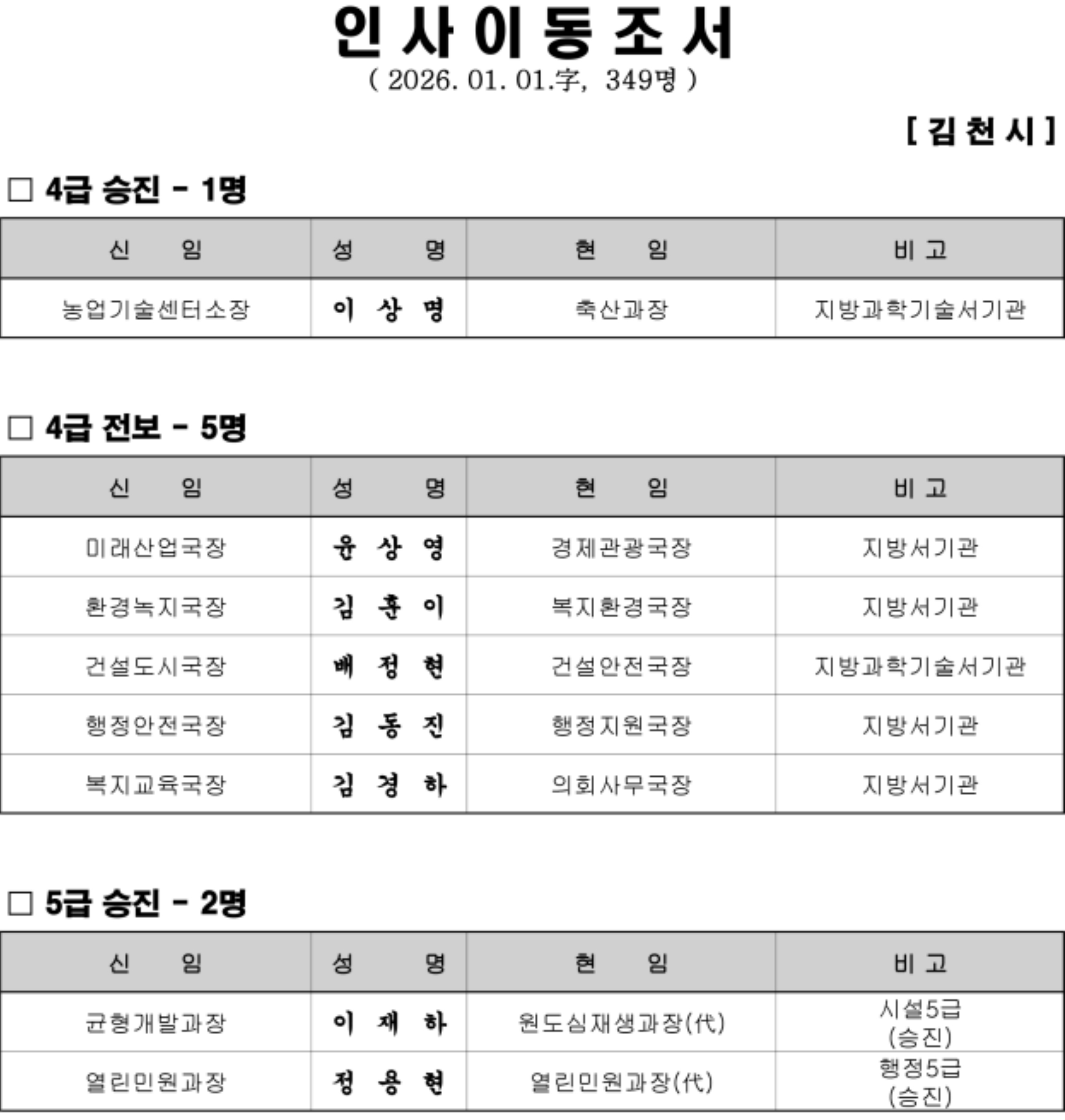 김천시는 26일 1월 1일자 인사를 발표했다.