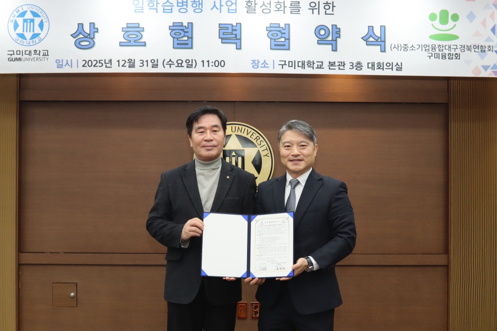 구미대학교(총장 이승환)가 (사)중소기업융합대구경북연합회 구미융합회(이하 구미융합회)와 상호협력 체계를 구축하는 협약을 체결했다고 5일 밝혔다.