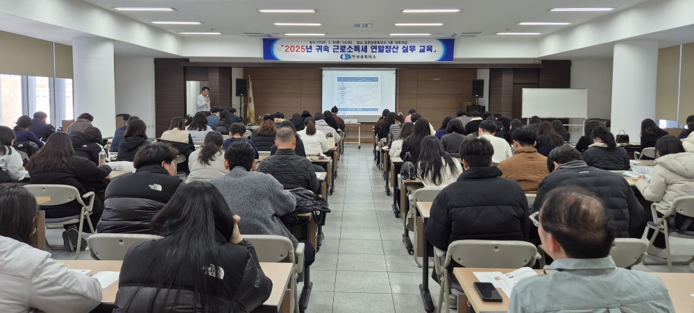 김천상공회의소(회장 안용우)는 김천세무서와 공동으로 지난 1월 8일 4층 대회의실에서 ‘2025년도 귀속근로소득세 연말정산 실무교육’을 실시했다.