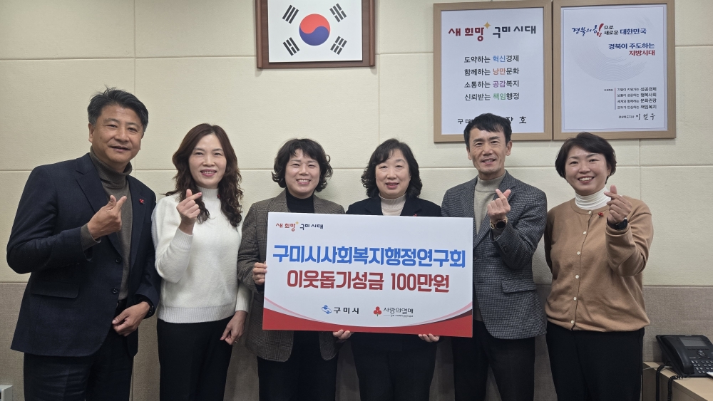 구미시 사회복지직 공무원 모임인 구미시사회복지행정연구회(회장 박용자)는 지난 8일 구미시에 ‘새 희망 행복나눔’ 사업에 사용해 달라며 성금 100만 원을 기탁했다.