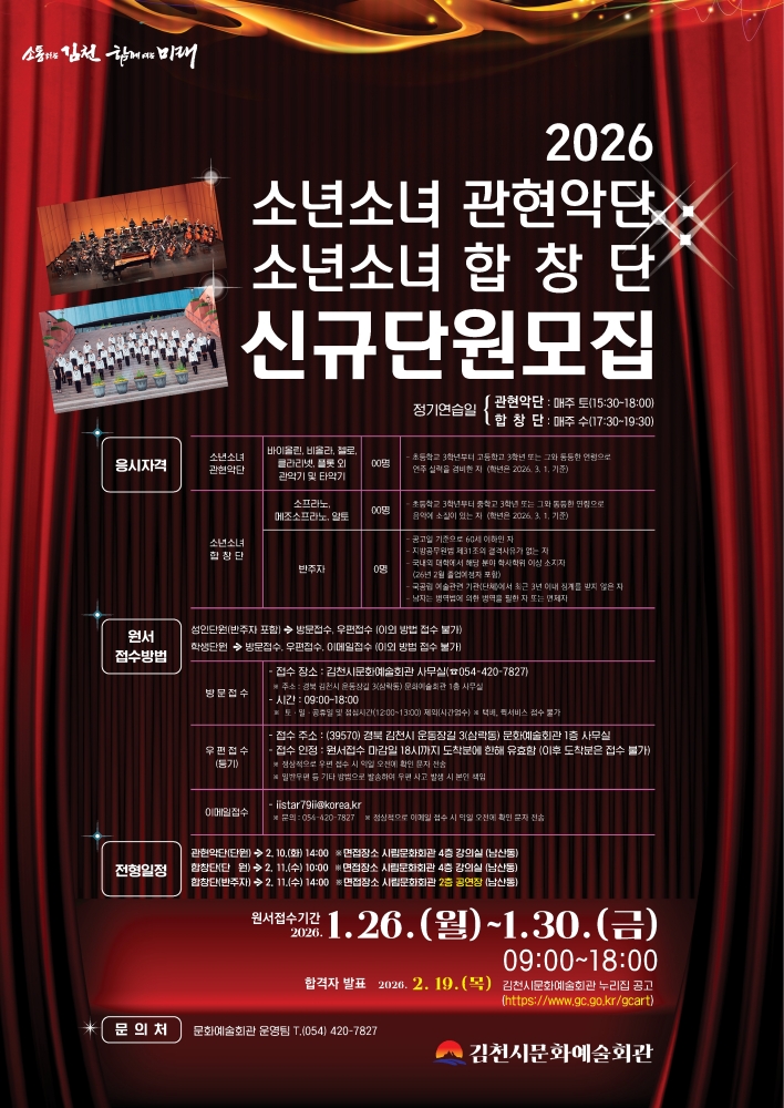 자세한 사항은 김천시 문화예술회관 홈페이지(누리집 https://www.gc.go.kr/gcart) 공지사항을 확인하거나, 문화예술회관 사무실(054-420-7827)로 문의하면 된다.