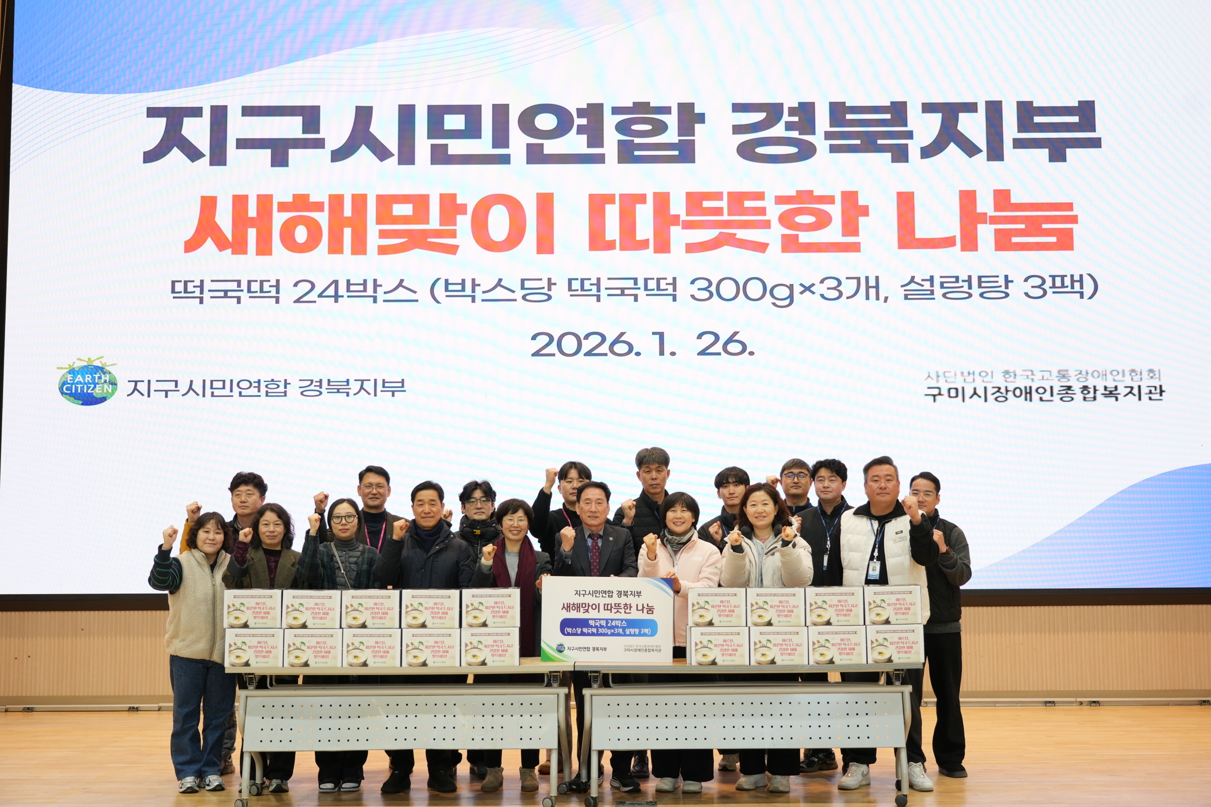 지구시민연합 경북지부(지부장 황서연)는 1월 26일 지역사회 나눔 실천의 일환으로 구미시장애인종합복지관(관장 김휴진)에 떡국떡과 레토르트 설렁탕을 전달했다.