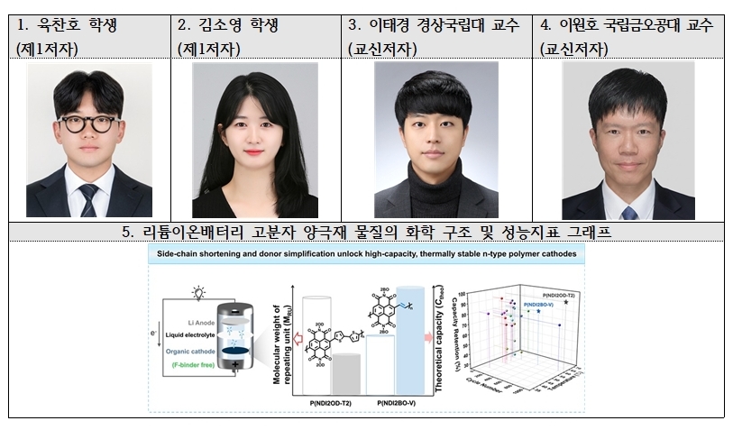 이번 논문의 제1저자인 고분자공학과 육찬호 석사(졸업)와 김소영 박사과정은 “유기 양극재의 성능을 높이는 성과를 넘어, 분자 구조 변화가 성능으로 이어지는 과정을 다양한 분석으로 확인하면서 연구에 대한 흥미와 확신이 더 커졌다.”며 “후속 연구를 통해 고성능 유기 양극재 설계 전략을 확장해 나가겠다.”고 밝혔다.