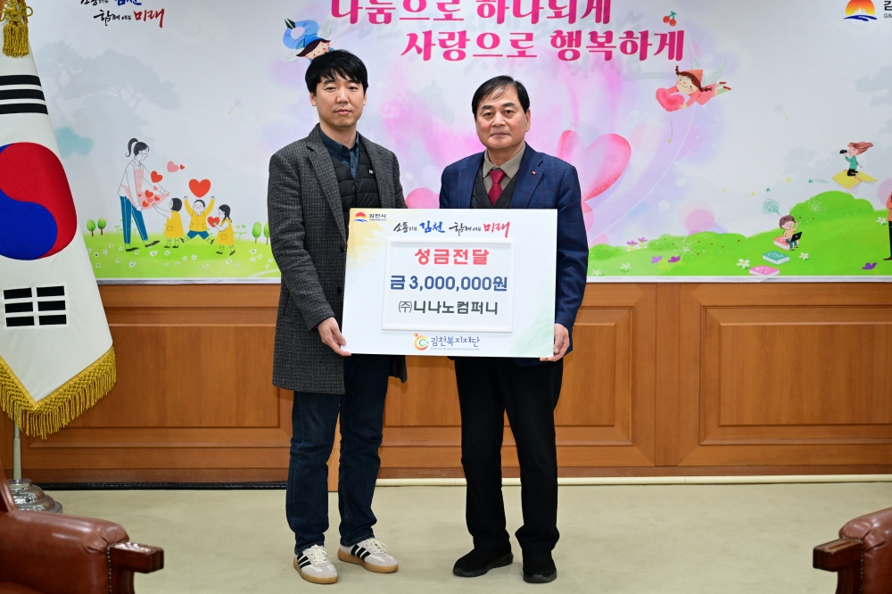 김천복지재단(이사장 배낙호)은 지난 26일, ㈜니나노컴퍼니(대표 김건홍)로부터 이웃돕기 성금 3백만 원을 전달받았다고 밝혔다.
