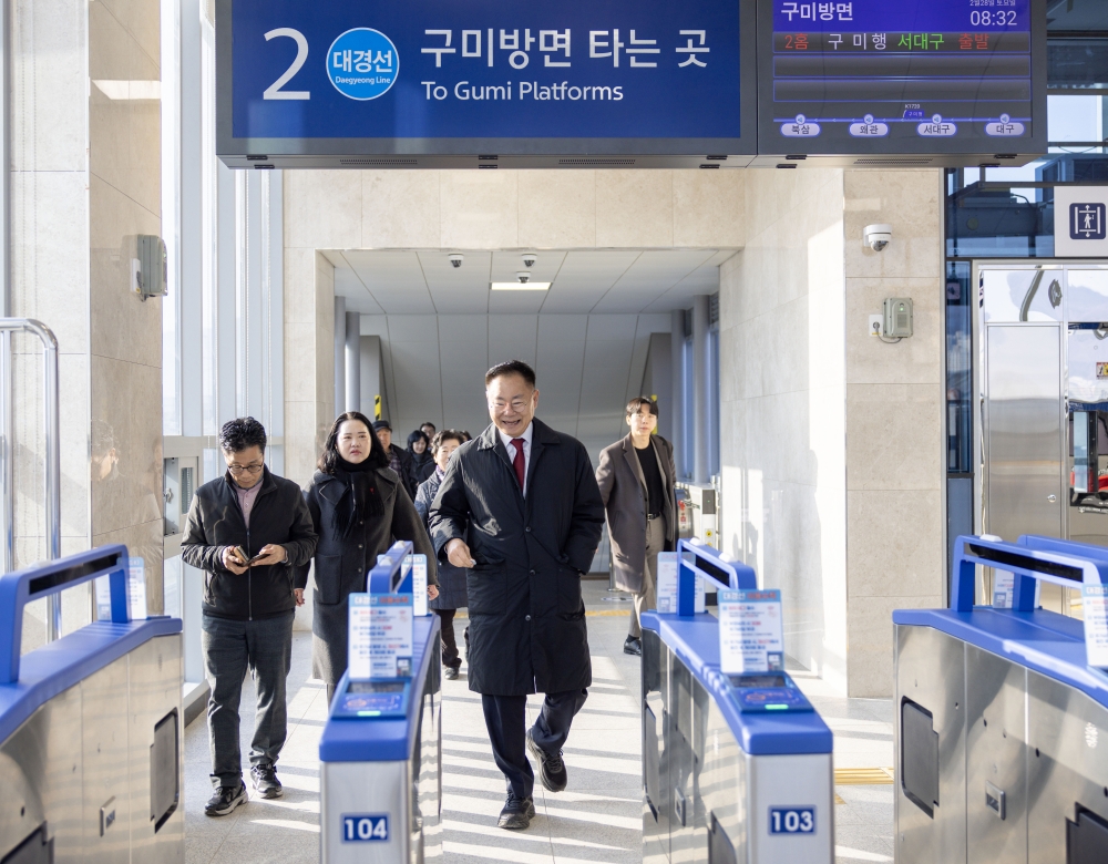 김재욱 칠곡군수와 한영희 부군수, 주요 간부 공무원들은 지난달 28일 왜관역에서 대경선 열차를 타고 북삼역까지 이동했다. 열차 운행 간격과 정시성, 승강장 안전시설, 안내 체계, 승하차 동선을 차례로 확인했다. 출퇴근 시간대 혼잡 가능성과 환승 이동 경로, 역사 내 편의시설 배치 상황도 함께 점검했다.