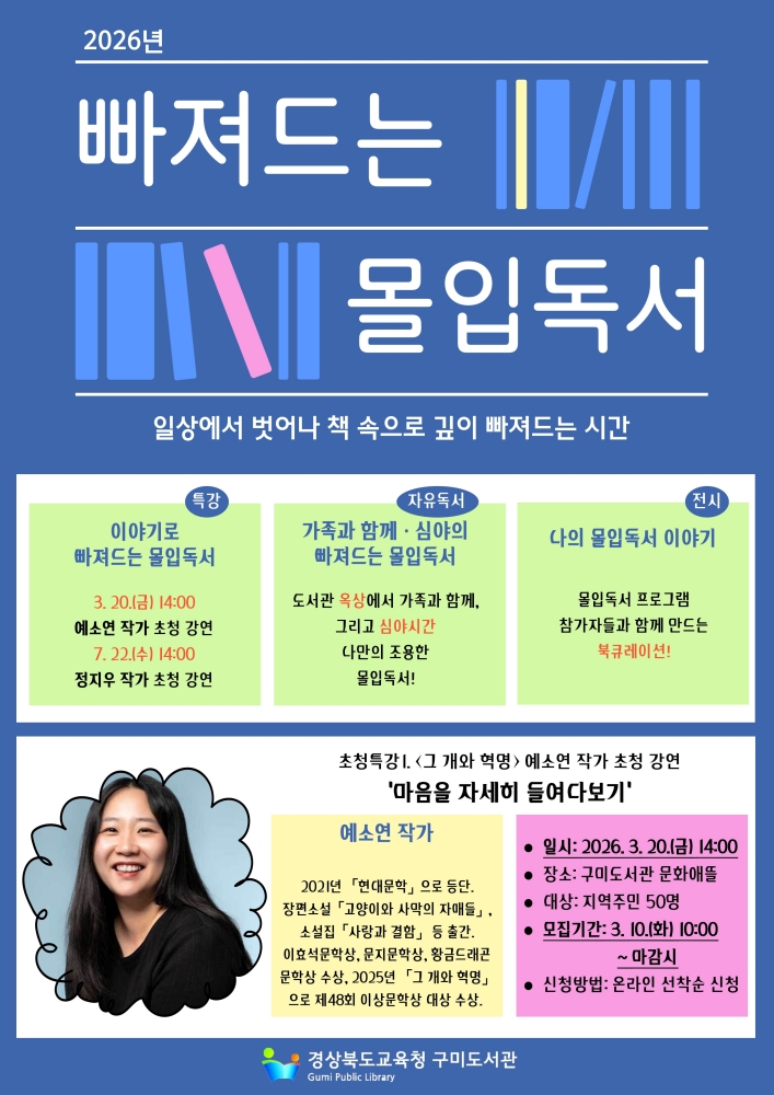 오는 3월 20일 오후 2시에는 예소연 작가를 초청해 ‘마음을 자세히 들여다보기’를 주제로 특강을 개최한다. 이번 특강에서는 작품 속 인물과 감정을 통해 자신의 마음을 깊이 들여다보는 시간을 갖고, 문학이 개인의 삶에 건네는 위로와 통찰에 대해 이야기 할 예정이다.