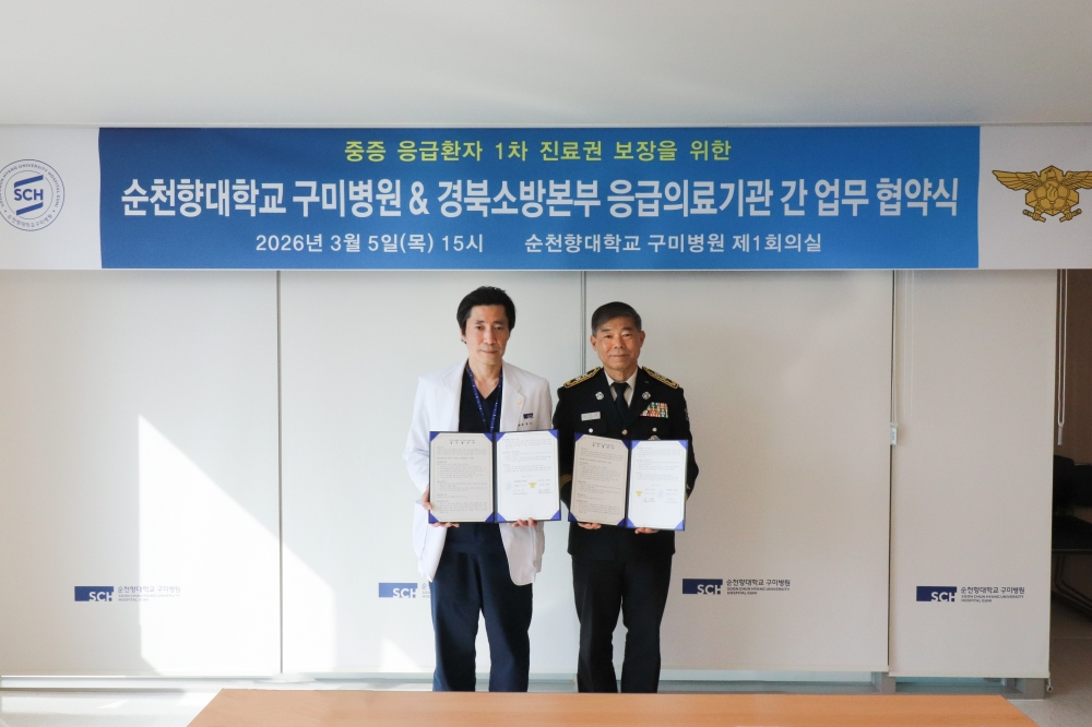 김성호 병원장은 “중증 응급환자에게는 신속한 이송과 빠른 치료가 무엇보다 중요하다”며 “순천향대 구미병원은 응급의료센터와 365소아청소년진료센터를 운영하며 지역 응급의료체계를 구축하고 있고, 특히 심장질환과 뇌혈관질환 분야에서는 여러 지역에서 환자들이 찾아올 만큼 응급진료 역량을 갖추고 있다.”고 말했다.