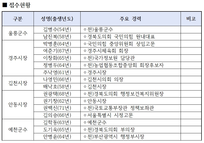 국민의힘 경북도당(위원장 구자근)이 제9회 지방선거 기초단체장 접수 결과를 발표했다.
