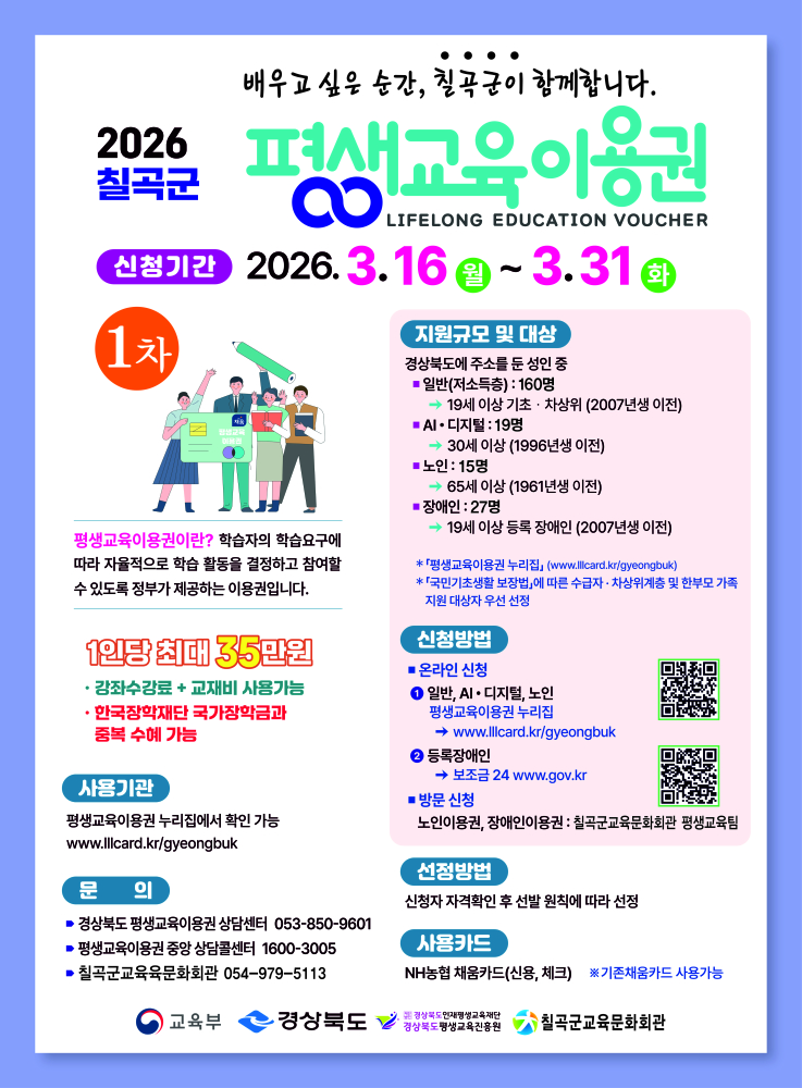 칠곡군은 저소득층, 노인, 장애인 등 교육 소외계층 221명을 대상으로 ‘2026년 평생교육이용권’ 지원사업을 추진한다. 1차 신청 접수는 3월 16일부터 31일까지 진행된다.