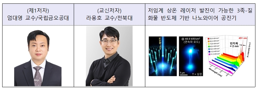 국립금오공과대학교 엄대영 교수와 전북대 라용호 교수 공동연구팀이 상온에서 저임계 레이저 발진(낮은 전류로 레이저 발진)이 가능한 3족-질화물(InGaN/GaN) 반도체 기반 나노와이어 공진 구조체 개발에 성공했다.