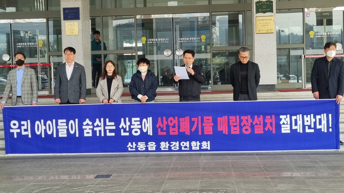 산동읍환경연합회(회장 이정곤)는 3월 17일 구미시청에서 구미시 산동읍과 해평면 일대에 추진되고 있는 GL엔텍의 지정·산업폐기물 매립장 설치 계획과 관련, 기자회견을 갖고 구미시의 명확한 불허 방침 재확인과 사업 계획 철회를 강력하게 촉구했다.