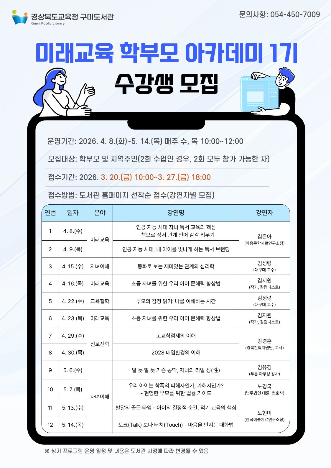 경상북도교육청 구미도서관(관장 최선지)는 3월 20일부터 자녀 교육에 관심 있는 학부모와 일반인을 대상으로 ‘2026년 미래교육 학부모 아카데미 1기’ 수강생을 모집한다.