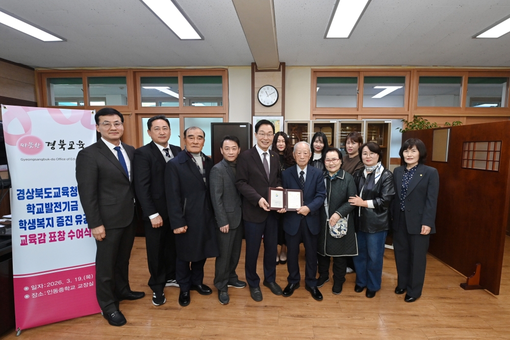 인동중학교(교장 황인일)는 3월 19일 임종식 경북도교육감이 본교를 방문하여 학생복지 증진에 이바지한 공로가 큰 인동중학교 총동창회에 교육감 감사패를 직접 전달했다.