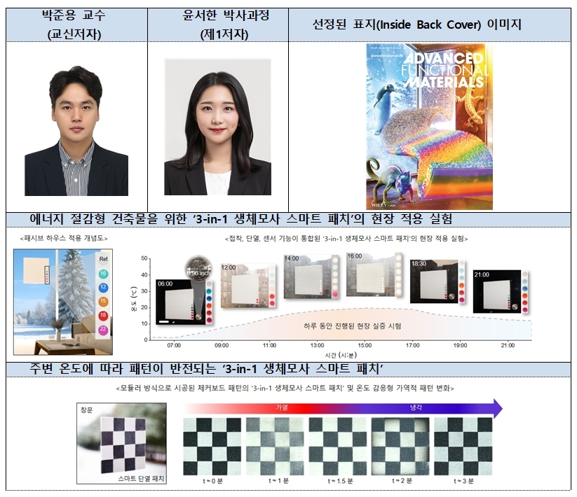 연구 결과는 ‘Bioinspired Trifunctional Patches for Adaptive and Energy-Efficient Thermal Management(적응형 및 에너지 효율적 열 관리를 위한 생체모사 삼중 기능 패치)’라는 제목으로 재료과학 분야의 저명 국제 학술지인 Advanced Functional Materials(IF: 19.0, JCR 상위 5% 이내)에 3월 23일자로 게재됐다. 윤서한 신소재공학과 박사과정(제1저자), 박준용 교수(교신저자)의 이번 연구는 연구의 독창성과 시각적 표현성을 인정받아 내부 표지(Inside Back Cover)로도 선정됐다.