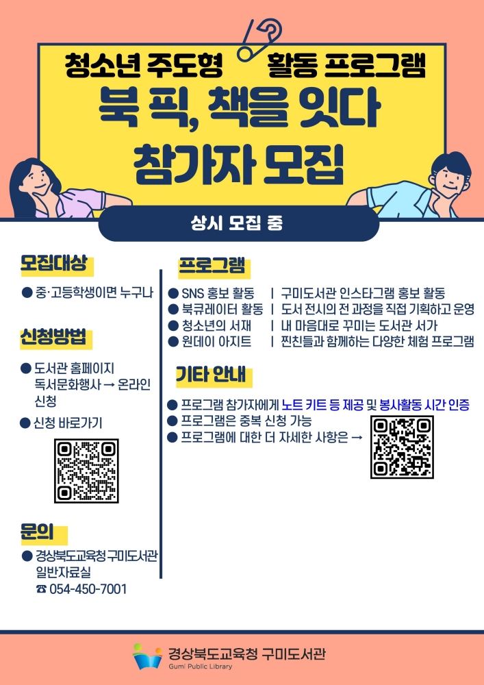 한편, 프로그램에 대한 자세한 사항은 도서관(https://www.gbelib.kr) 확인하거나 ‘북 픽, 책을 잇다’ 담당자(054-450-7001)에게 문의하면 된다.