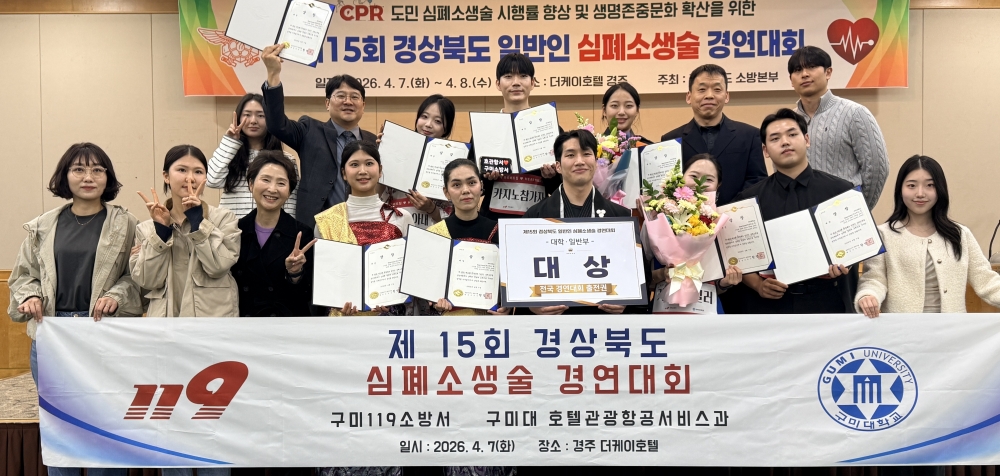 구미대학교(총장 이승환) 학생들이 ‘제15회 경상북도 일반인 심폐소생술(CPR) 경연대회’에서 일반부 대상을 수상해 응급처치 분야에서 뛰어난 역량을 입증했다. 이번 대상 수상으로 구미대는 오는 5월 28일 정부세종컨벤션센터에서 열리는 전국대회 출전권을 획득했다.