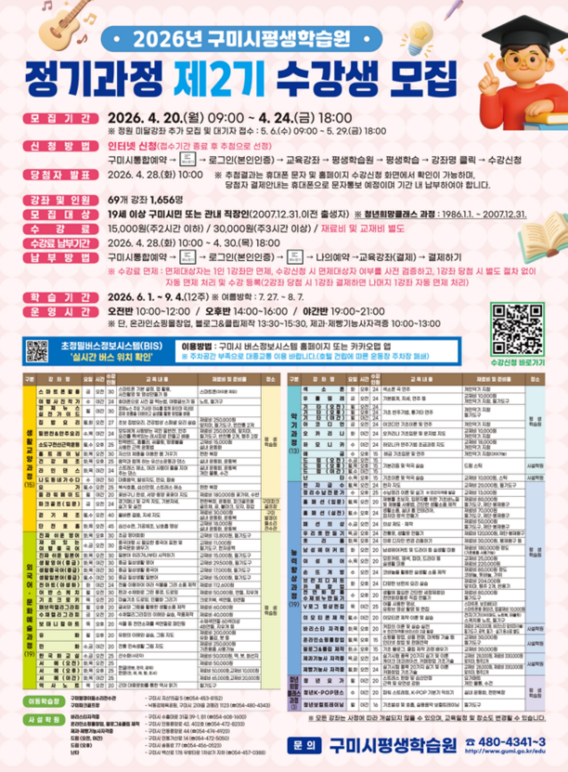 구미시는 4월 20일부터 24일까지 ‘구미시통합예약’ 포털을 통해 2026년 평생학습 정기과정 제2기 수강생 1,656명을 모집한다.